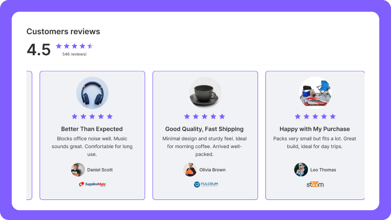 Use smart widgets to match reviews with buying intent on product pages, carts, or landing pages and influence decisions at key moments.