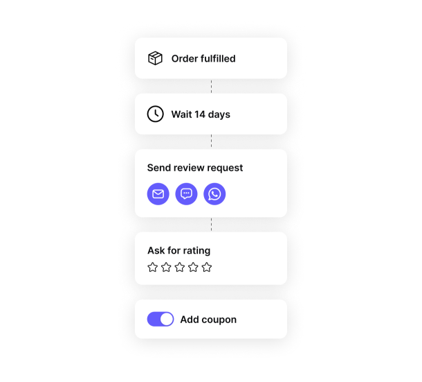 Send review reminders via email, SMS, or WhatsApp, timed perfectly with delays, incentives, and full automation in the background.