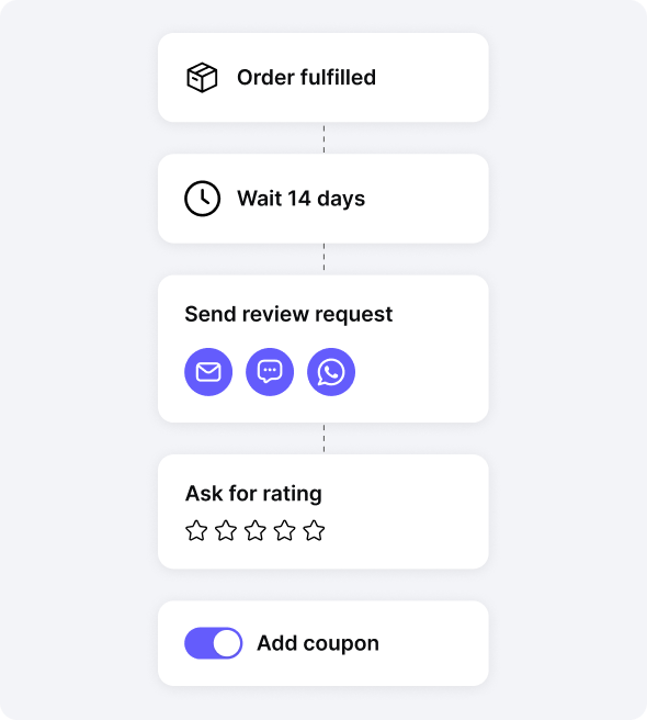 You can send review requests automatically via email or SMS based on order status (like “Delivered”). You can also time requests for better response rates.