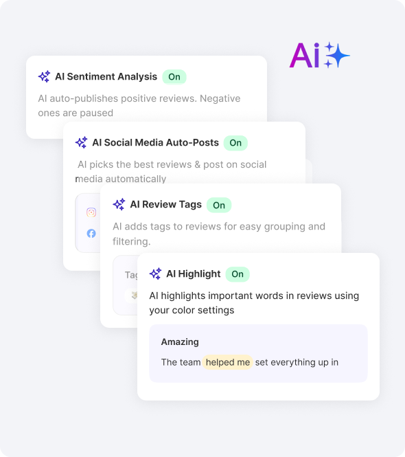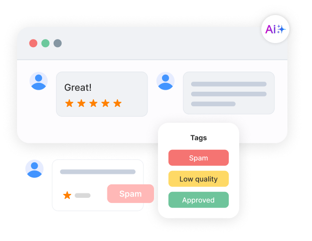 Filter reviews by keyword, rating, or type, with AI tags to block spam and publish only genuine reviews.