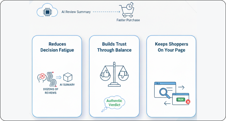 Research from the Nielsen Norman Group found that well-designed AI review summaries help shoppers assess product quality and fit significantly faster than scrolling through individual reviews.