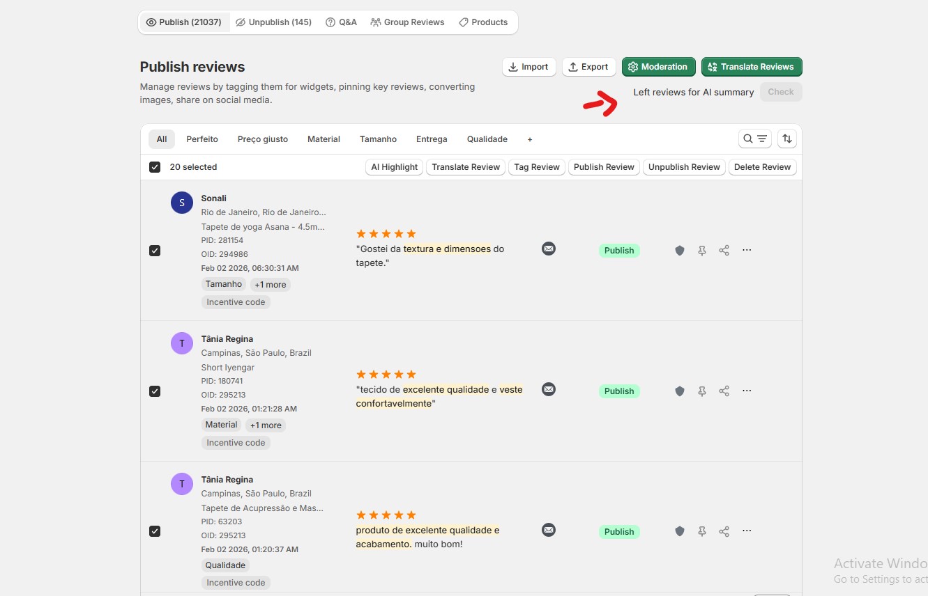 Click the AI Summary button in widgets. (e.g., Product review section, Review Wall, or Carousel).