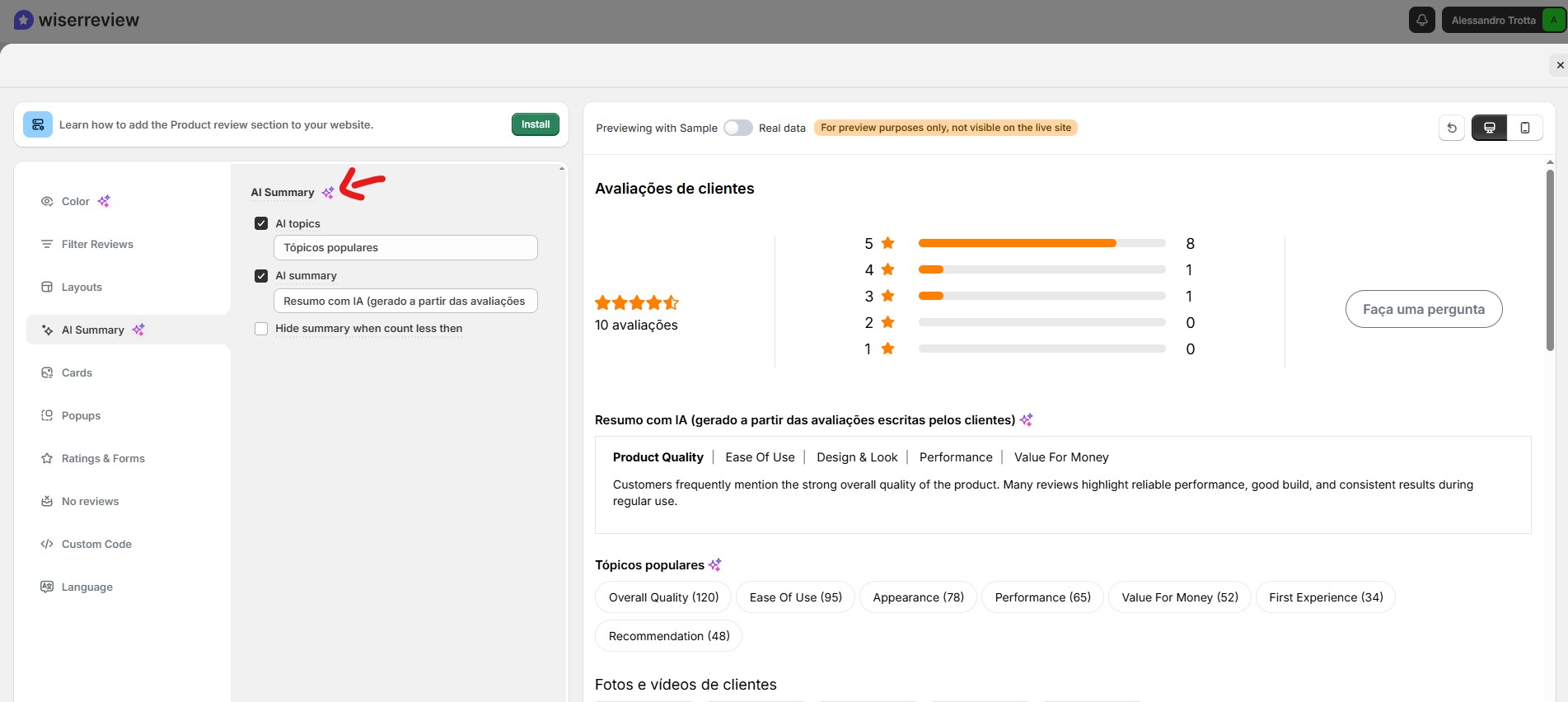 WiserReview helps you display an AI review summary clearly and simply. It collects customer reviews and turns them into short insights.