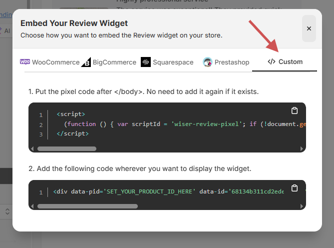 Copy the Pixel Code from WiserReview and paste it immediately before the closing </body> tag in the Layout section.