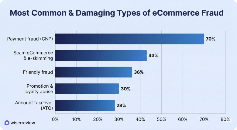 Card-not-present fraud remains the most common type of eCommerce fraud, but friendly fraud and account takeovers now cause more total losses for merchants.