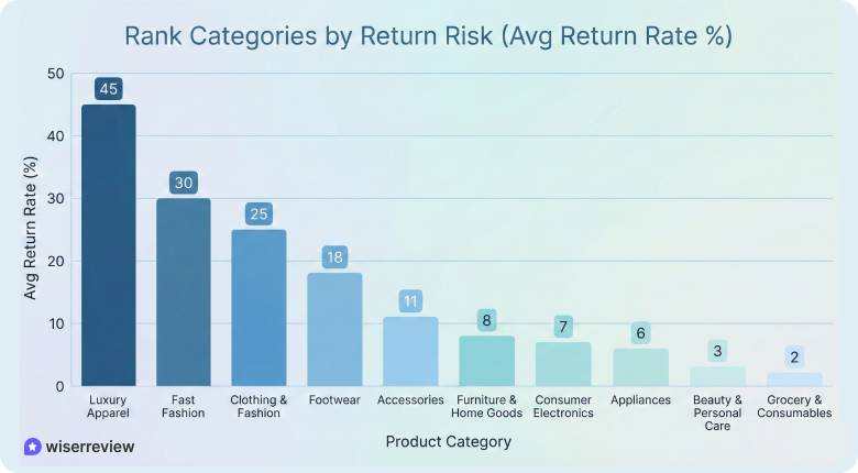 Return rates vary widely by product type. Items that depend on fit, appearance, or personal preference see far more returns.