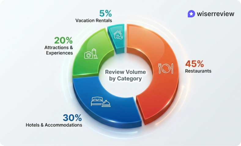 Restaurants generate the most reviews by volume. Tours and experiences show the fastest growth, driven by traveler demand for activities beyond hotels.
