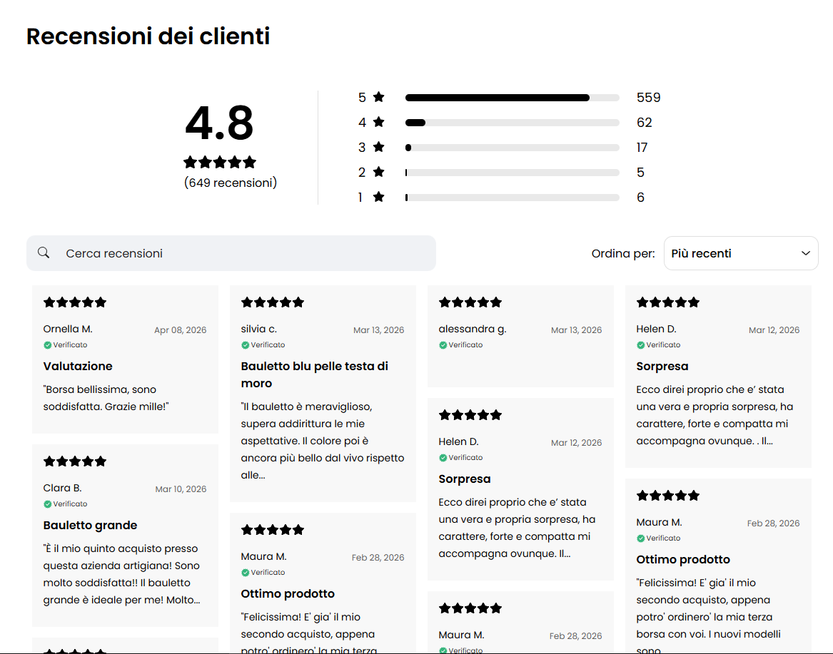 Verified product ratings flow to Google Shopping, so Be Your Bag Maxi, Portofino and Bauletto listings show their star rating in Google search results when Italian buyers look up a specific silhouette or a customisable leather bag.