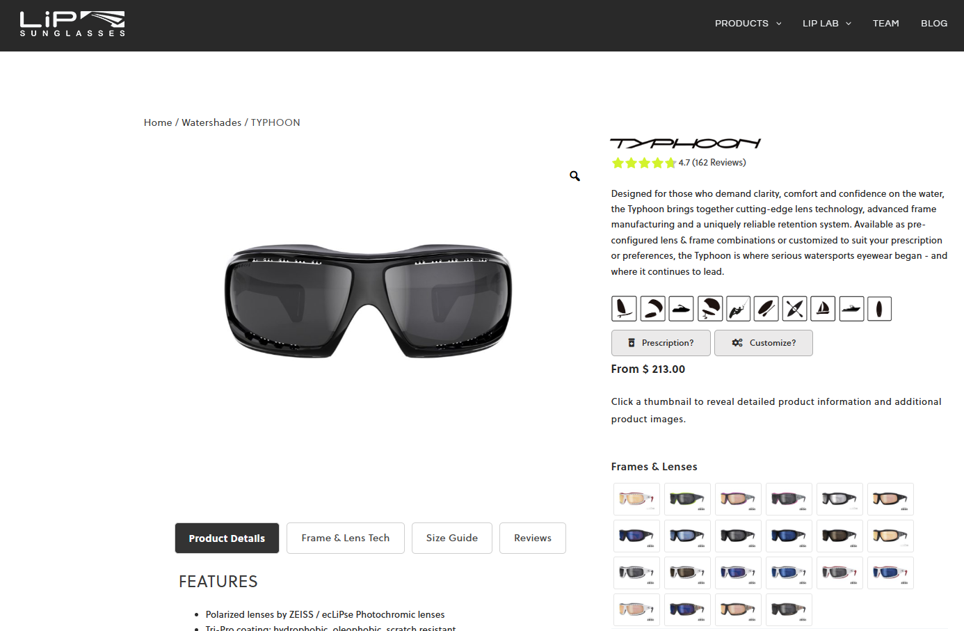 LiP Sunglasses makes functional eyewear for the water. The catalog is built around a set of performance frames: Watershades, Typhoon, Surge, Surge Aero, Tide and FLO, plus Custom and RX variants of each. The lenses come from ZEISS with hydrophobic, oleophobic and hard coatings, the frames use TR90 with retention systems and full interior cushioning, and the range is aimed at kitesurfers, windsurfers, sailors, foilers, SUP riders, jet skiers and fishing enthusiasts. The store runs on WooCommerce in USD and ships worldwide. 500+ products sit behind the catalog, and 400+ verified reviews now sit behind the products.