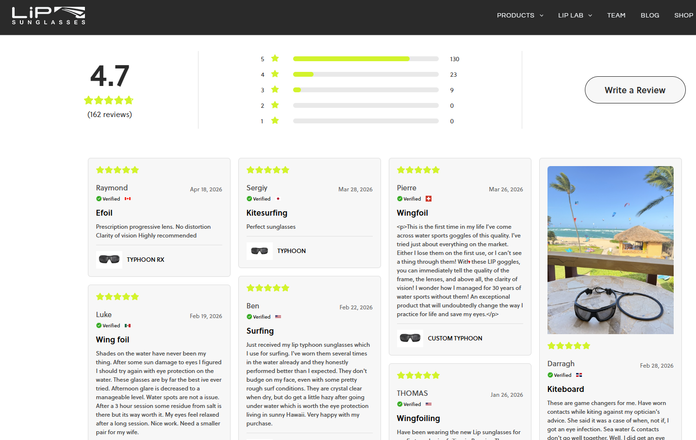 How LiP Sunglasses moved 400+ reviews off Judge.me and put a full widget stack, including the Sidebar Snippet, across a 500+ product catalog of kitesurf, windsurf, sailing, foiling and SUP eyewear.