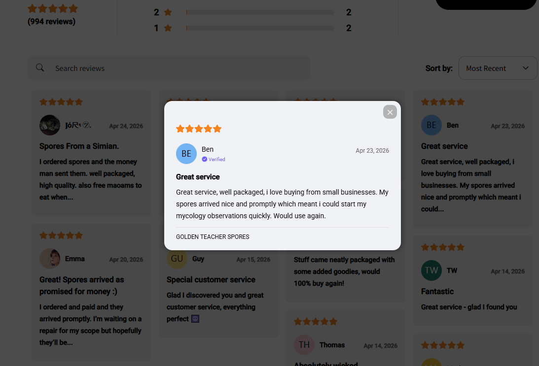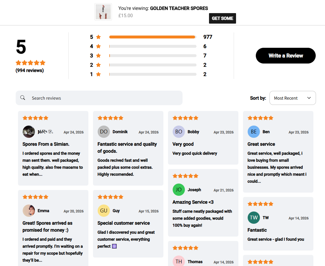 Spore syringes are a research purchase, and UK shoppers do their homework before they pick a strain. The Review Wall on Orangutan Trading Co's storefront pulls every verified review onto one page on the existing WooCommerce theme. The same pool runs the PDP and the Star Rating, so the Review Wall, the product page and the rating under the product title all read from one source.