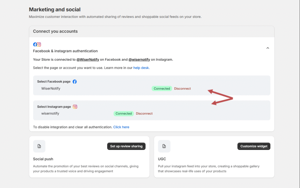 • Once connected successfully, you’ll see your account name and the Connected status.