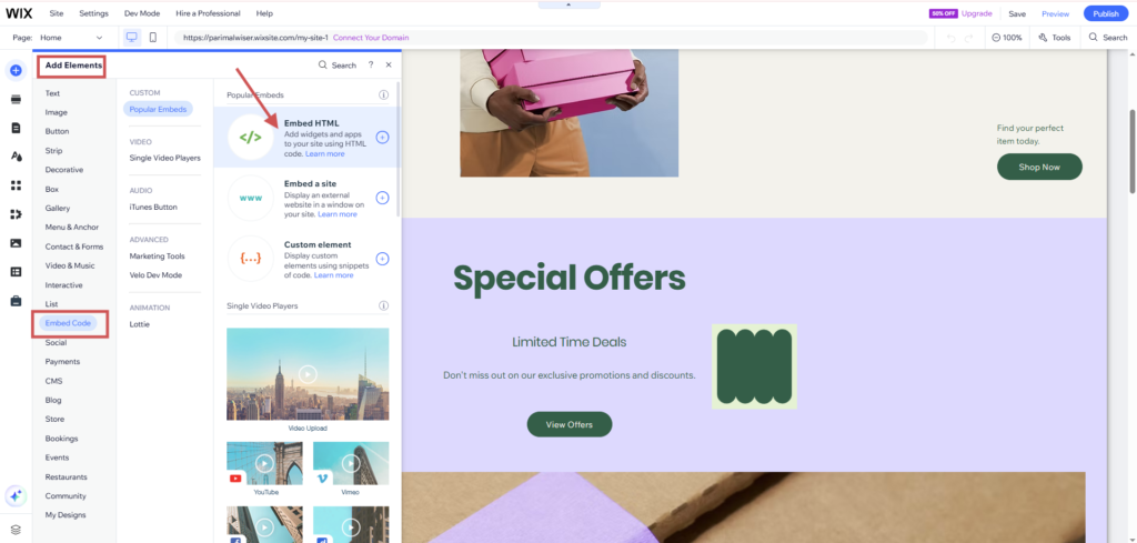 - Add Element -> Embed Code -> Embed HTML.
