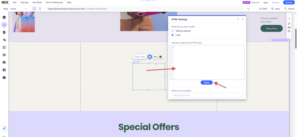 - Paste the wiserreview widget code here. Then click on apply and publish your site.