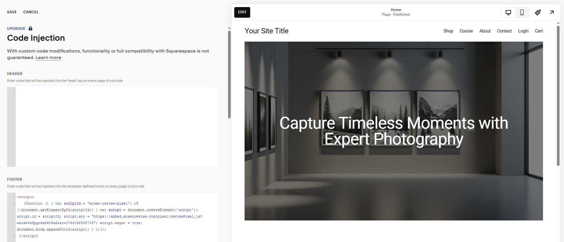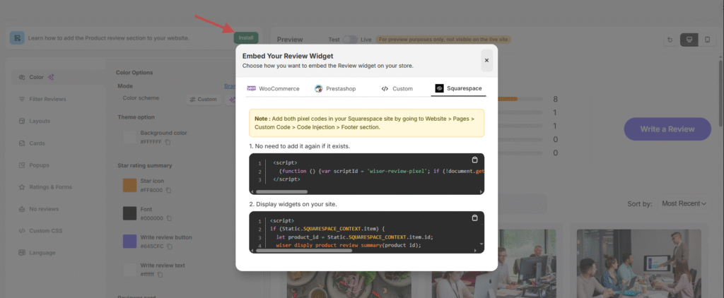 In Squarespace, go to Settings → Advanced → Code Injection → Under the Footer section, paste the WiserReview embed script.