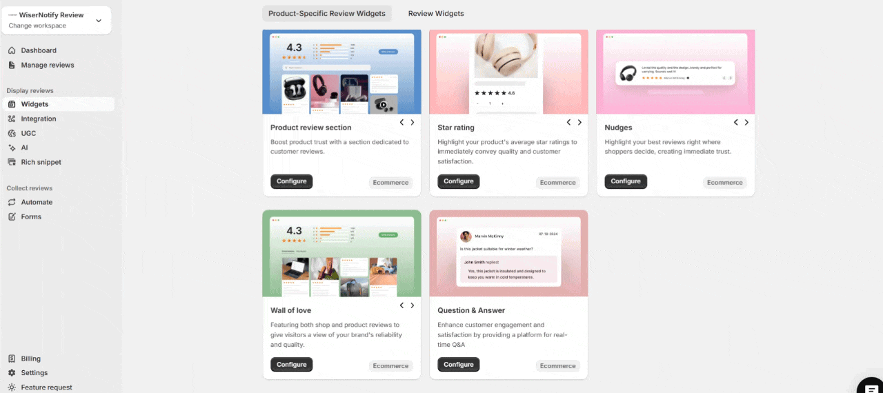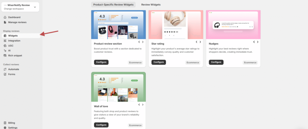 Under the Product-Specific Review Widgets tab, you’ll see available widget types: