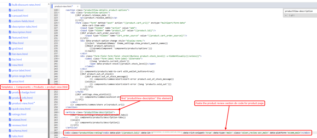 If you don’t find the “productView” element in product-view.html, search for the “productView-description” element