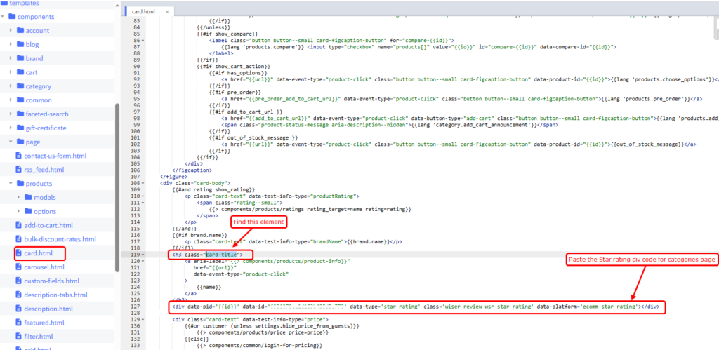 • Click Templates > Components > Products, then open file card.html. If you don’t have this file, search for the file that contains your Category Pages data (You can find it by searching for it using CTRL+F & search for “card-title” element