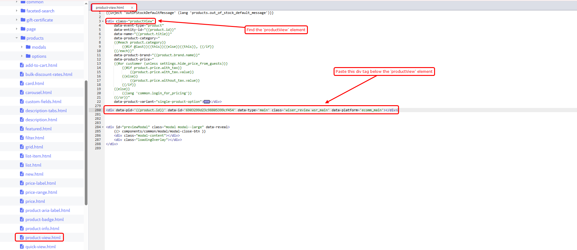 • Paste the following code below the “productView” element, which you can find by searching for it: