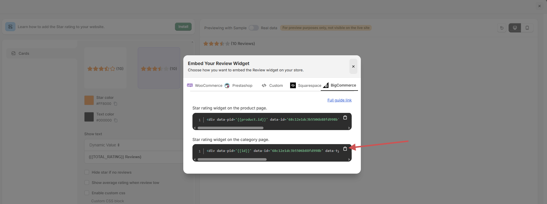 • Go to widgets > Product Review section widget > Install > Copy this div code under the Bigcommerce tab :