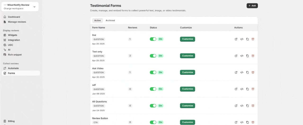 1. In your WiserReview dashboard, navigate to Forms under Collect Reviews.