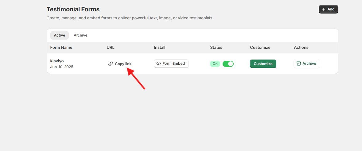 - You will see a list of your products along with a “Copy Link” button next to each product name. This allows you to generate a review link specific to each product.