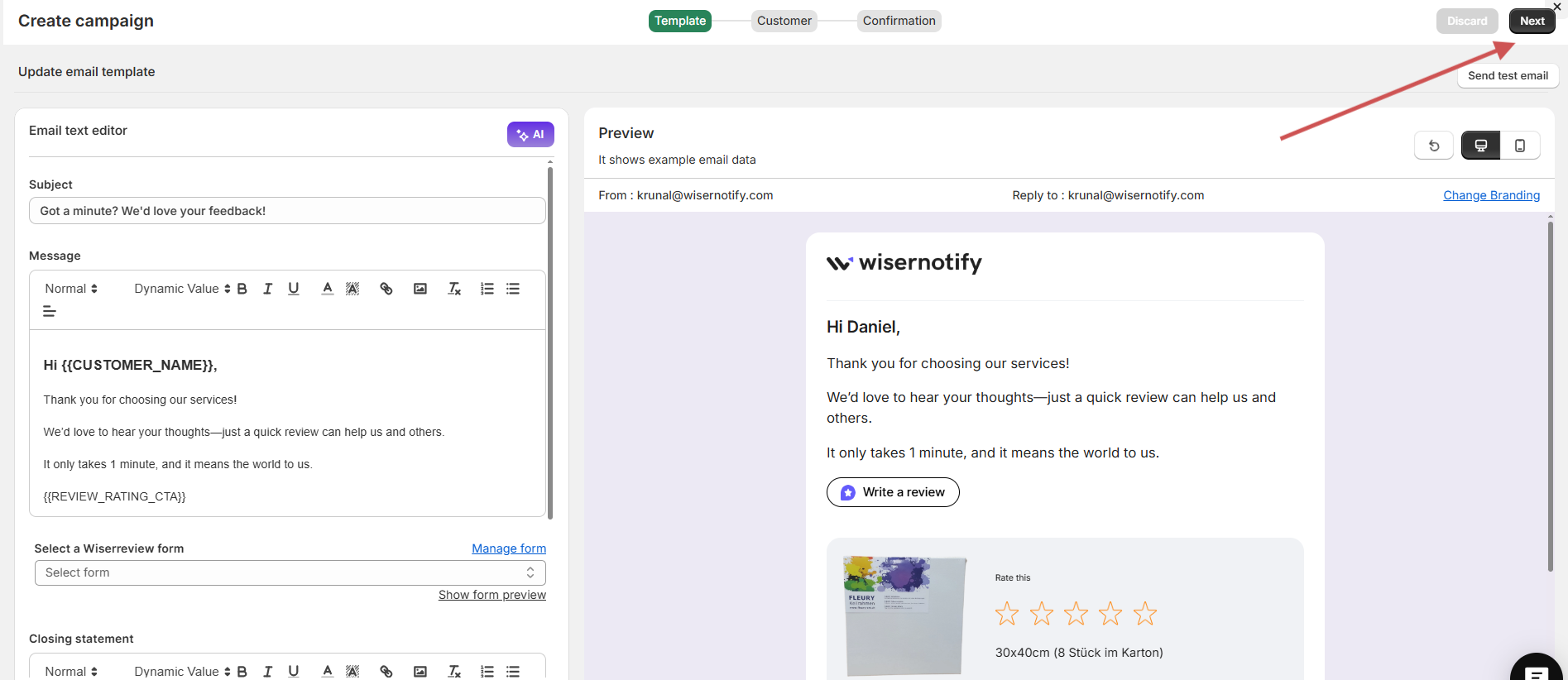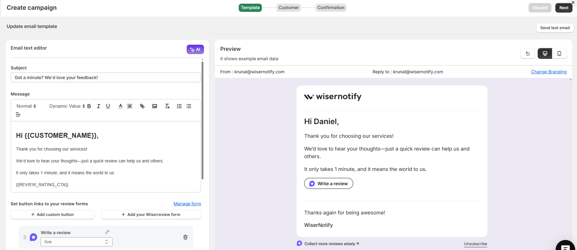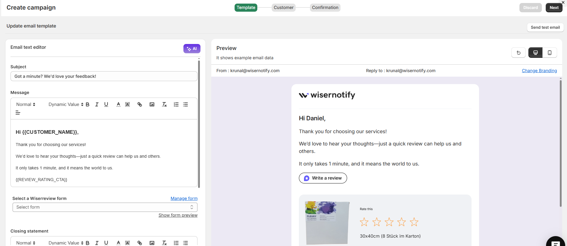 Both templates automatically link to your selected WiserReview form and include dynamic placeholders for customer name, product name, and more.