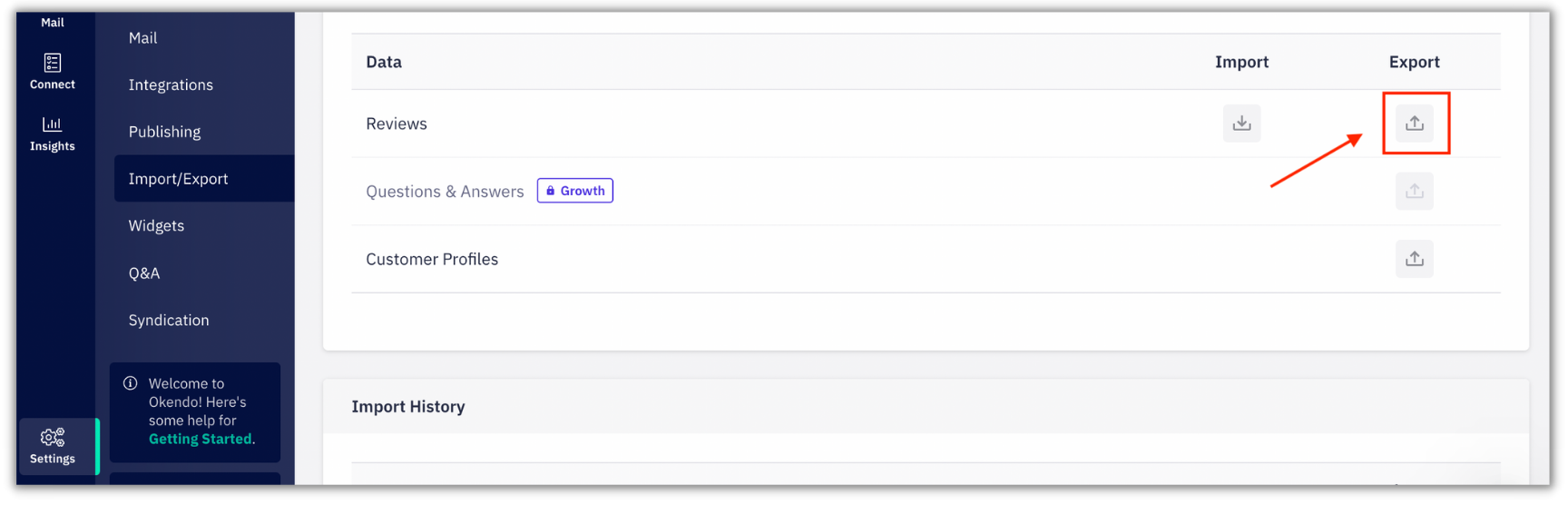 In Okendo’s dashboard, go to Settings → Import/Export.