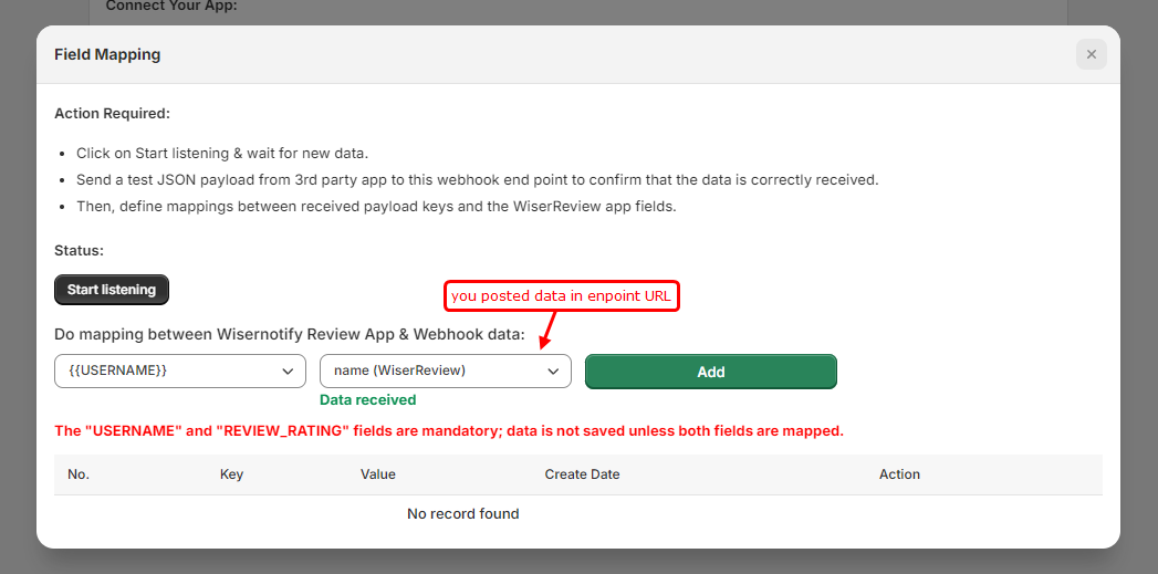 1. Send sample data to the provided URL so you can map it in WiserReview. Once the data is mapped, we can proceed with saving it in next data.