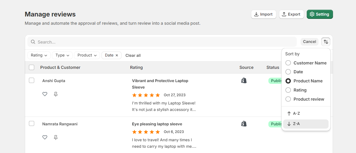 Filtering Options: Utilize filtering options to sort reviews based on various criteria such as rating, date, product, customer name or status (approved, pending, rejected).