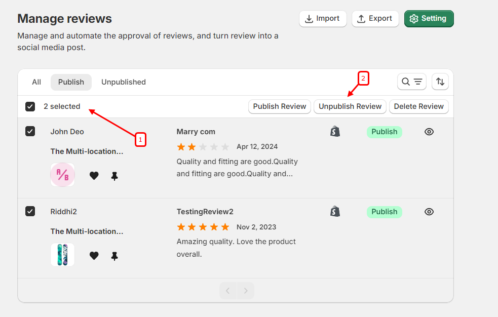 - The Review Publish and Review Unpublish features in WiserNotify Review Collector provide you with robust control over the visibility of customer reviews on your Shopify store. By utilizing three distinct tabs – ‘All’, ‘Publish Review’, and ‘Unpublish Review’ – you can seamlessly manage and curate the review content displayed to your customers.