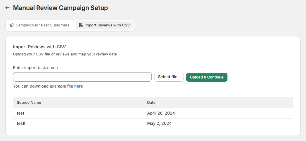 - This facilitates easy data transfer and review management.You can download an example file by clicking on the here link provided in the interface.