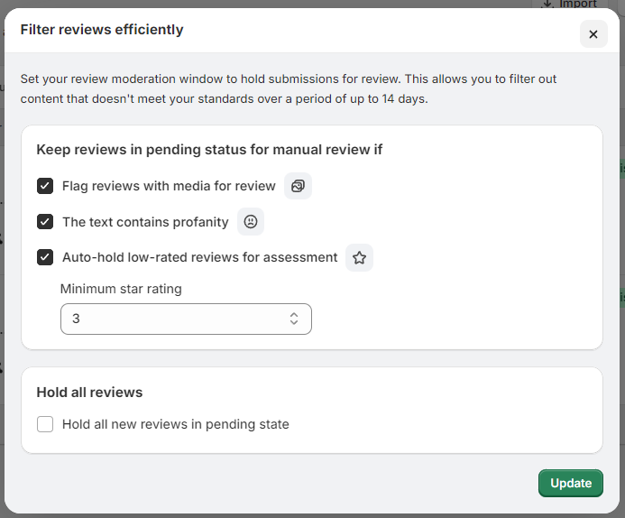 Setting: “Review Moderation Settings” feature allows users to set criteria for holding reviews in a pending status for manual review.