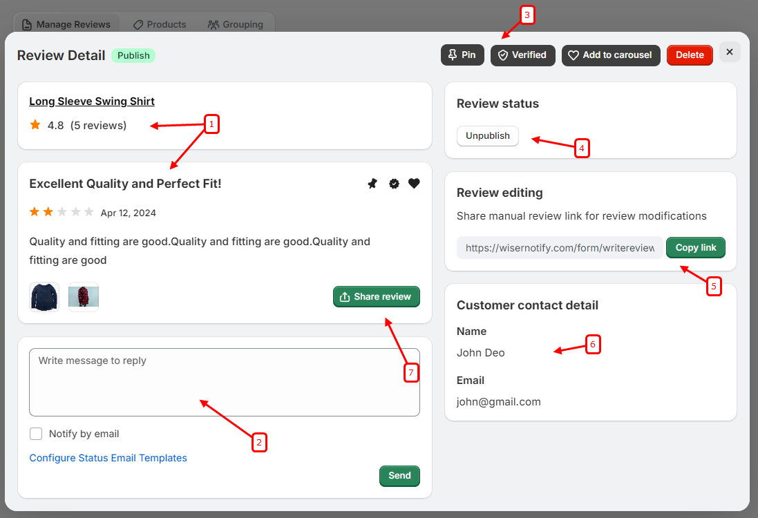 3. Pin/Verified/Add to carousel/Delete: “Pin” button allows you to pin the review, which will display it at the top of the review list.