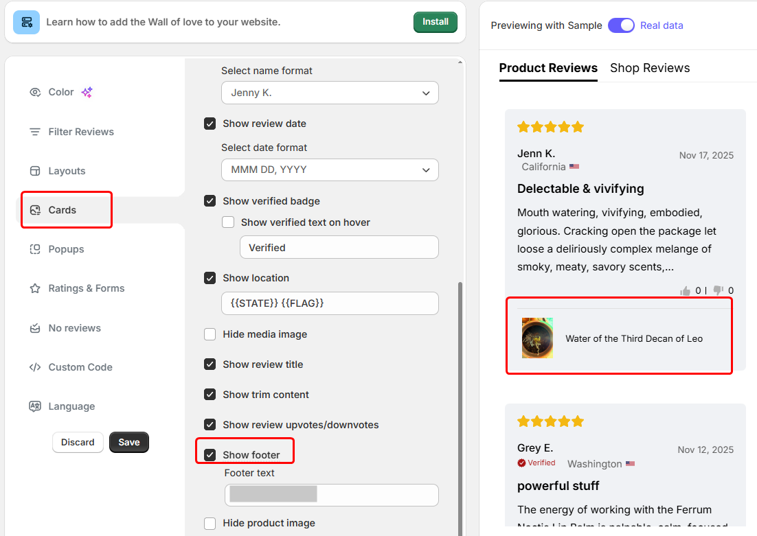 To display product details on each review card: