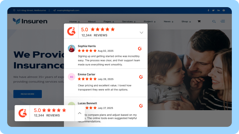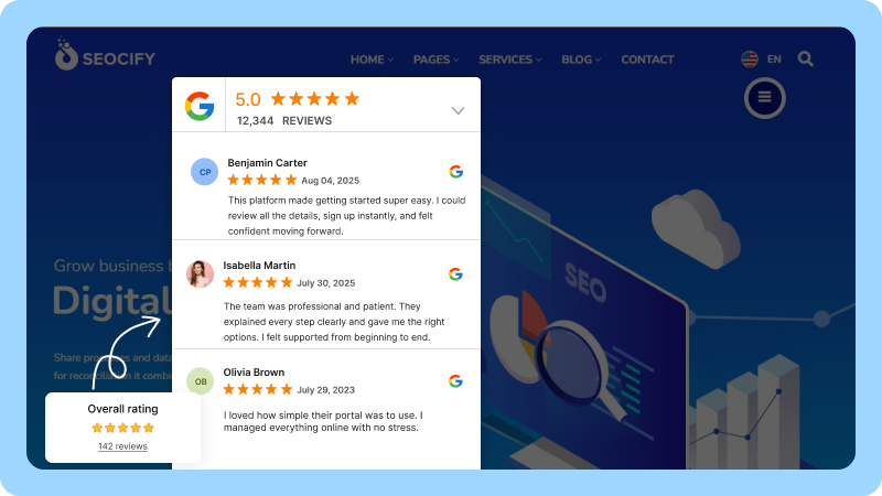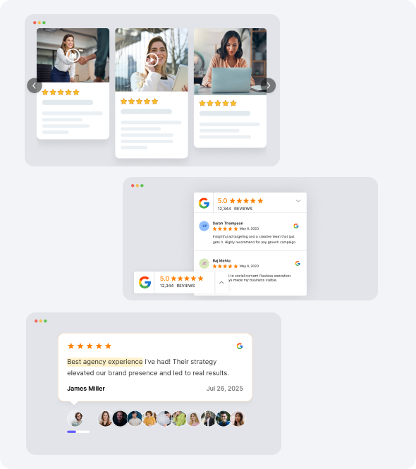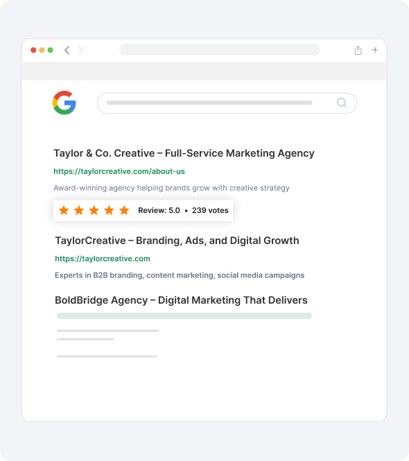 Our Google-ready widgets and SEO-friendly markup ensure your reviews show up in search results, helping attract more high-intent leads to your site and listings.