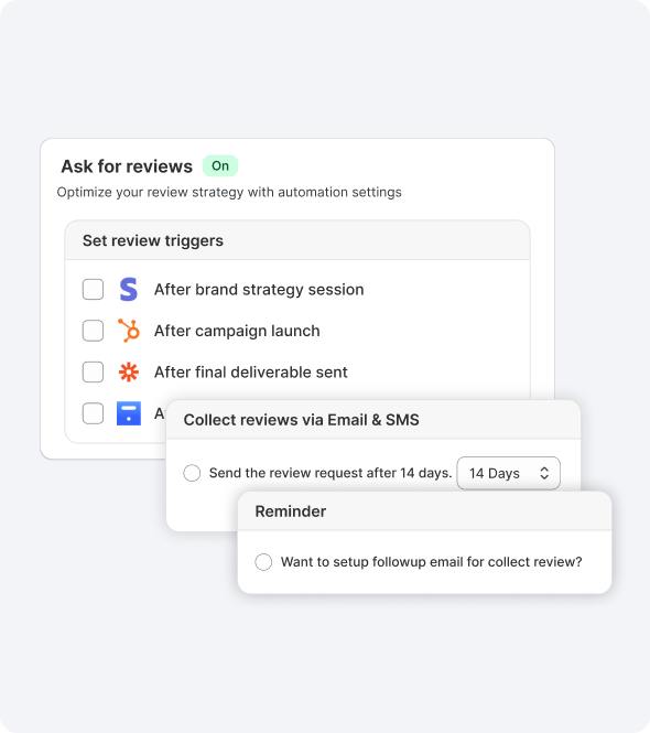 Send review requests on autopilot. Set triggers, reminders, and rewards, no follow-up needed.