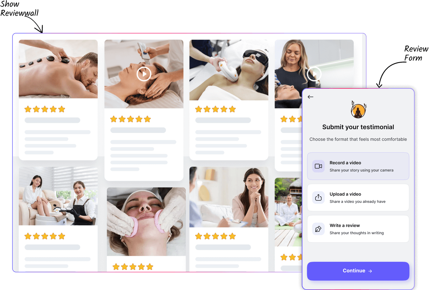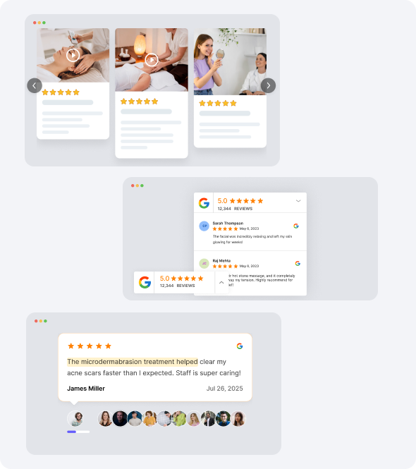 WiserReview lets you place written, photo, or video testimonials right next to treatment descriptions or “Book Now” buttons, reducing hesitation and increasing conversion rates.