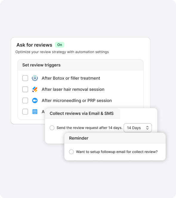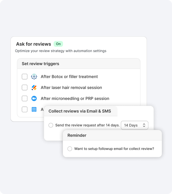 Trigger review requests automatically after services like fillers, facials, or laser treatments via SMS, email, or WhatsApp.