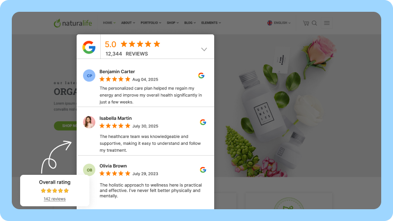 Highlight star ratings and reviews with a sleek, scrollable badge to build trust instantly.