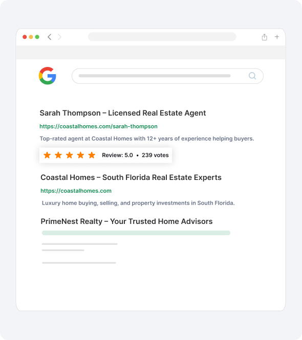 These visual cues improve click-through rates and help your site stand out in local and competitive real estate searches.