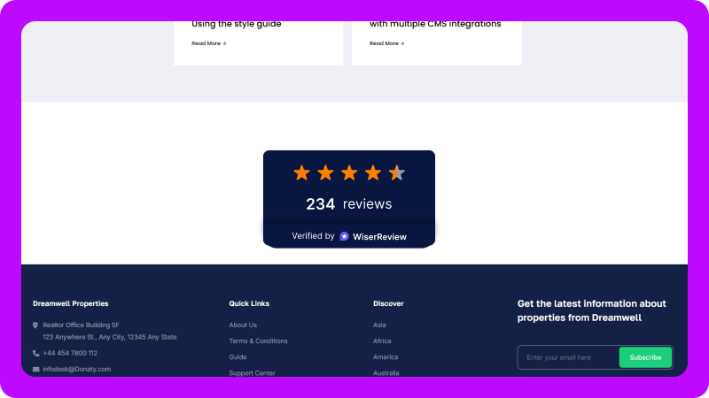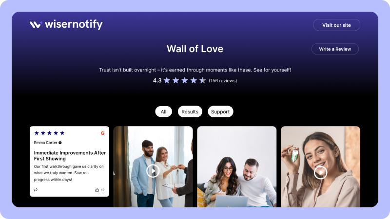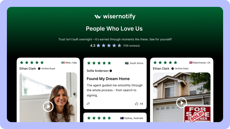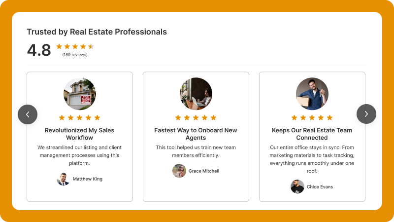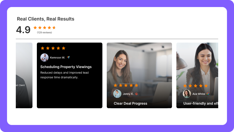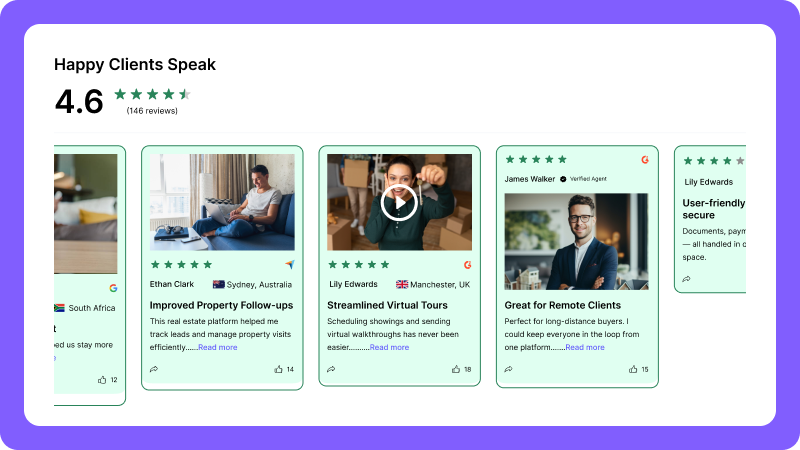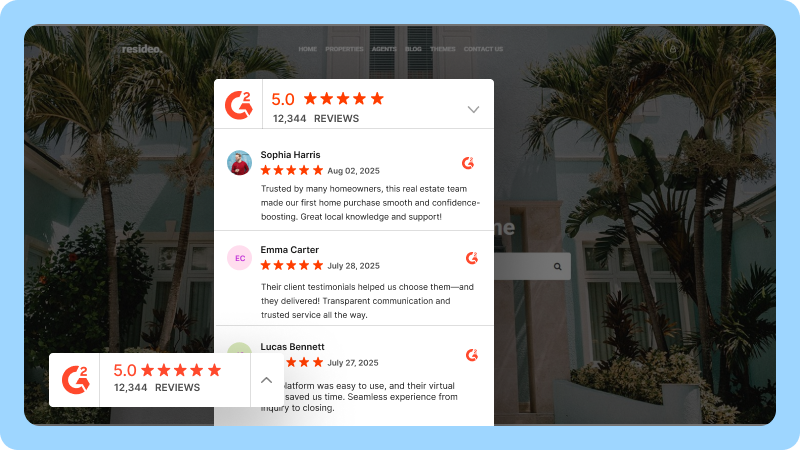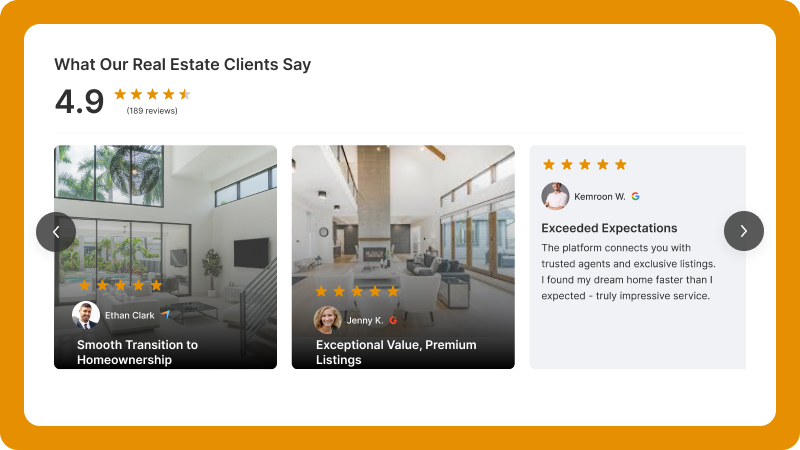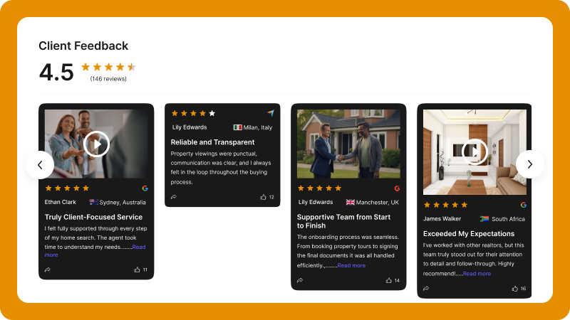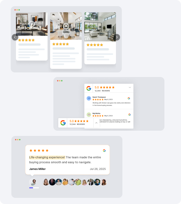 Add video or written reviews using floating widgets, carousels, or badges to pages where clients are comparing agents, requesting showings, or browsing properties.