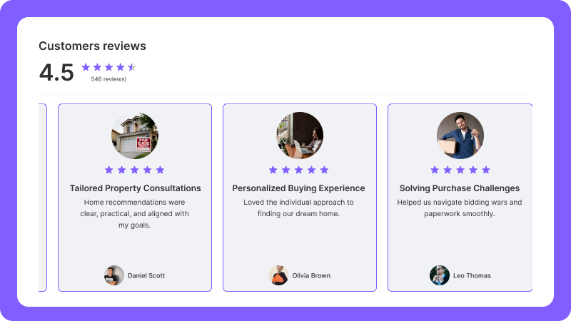 Highlight top client stories on property pages, landing sections, or lead forms. Choose from widgets that drive trust at every decision point.
