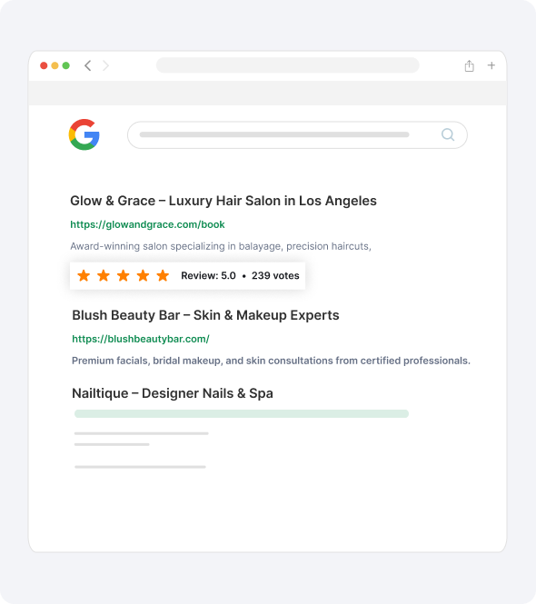 High ratings, detailed reviews, and client photos all help you rank higher and stand out from other salons, which means more calls, walk-ins, and online bookings.