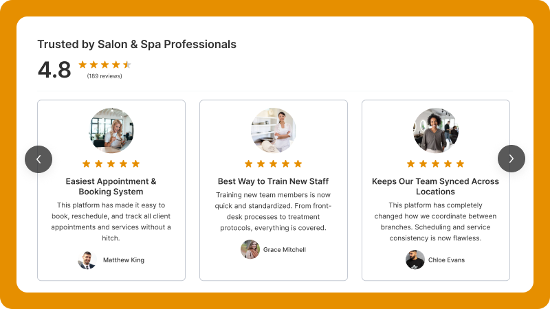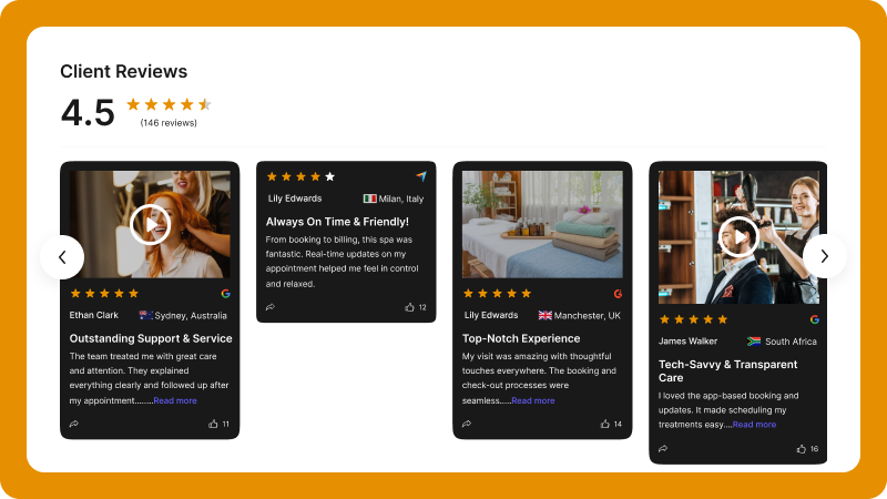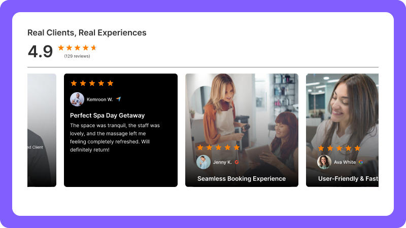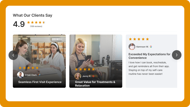 Sharing these reviews helps potential clients feel a personal connection with your team before they’ve even stepped inside which makes booking feel like a natural next step.