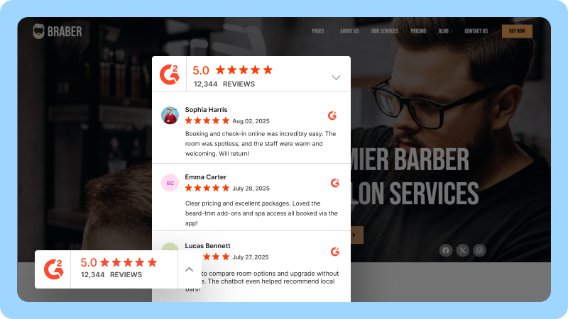 With WiserReview, you can place reviews right next to your service list, booking form, or special offer.