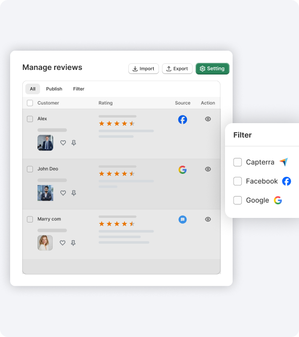 Curate and display reviews in a dynamic auto slider at key locations on your site.