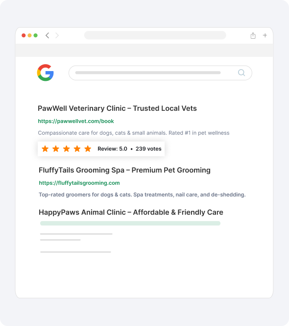 This not only makes your clinic stand out but also increases click-through rates from people looking for veterinary services nearby. More clicks mean more opportunities to win new clients.
