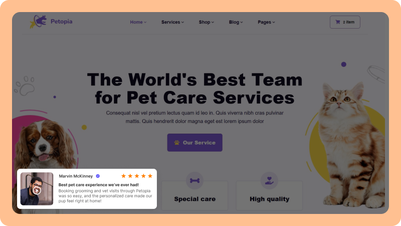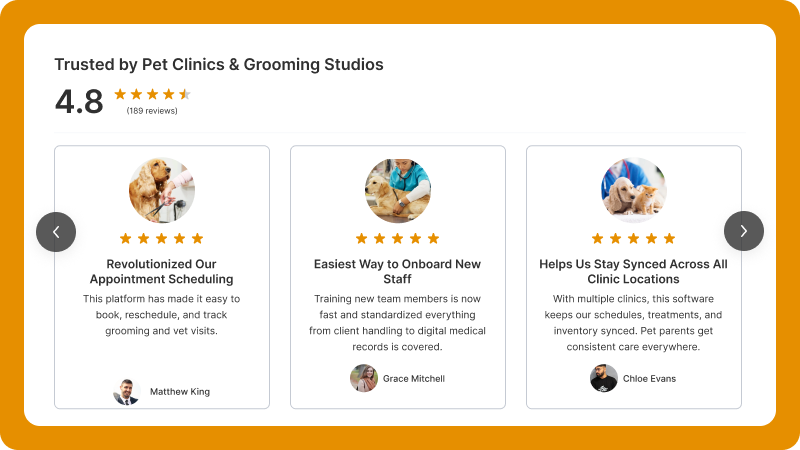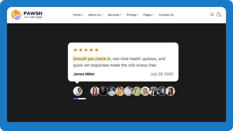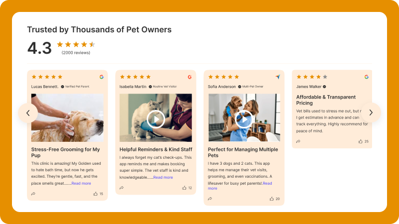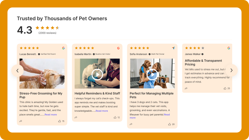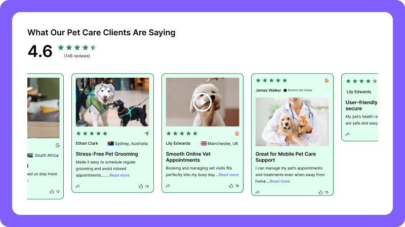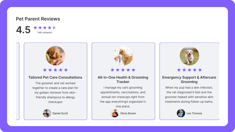 Showcase service reviews to highlight quality and build trust for both grooming and veterinary care.