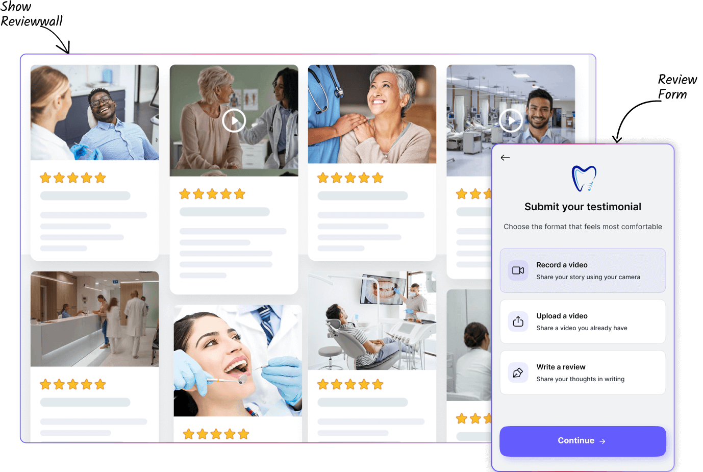Let patients upload images alongside their reviews and display them beautifully in carousels, grids, or service sections.